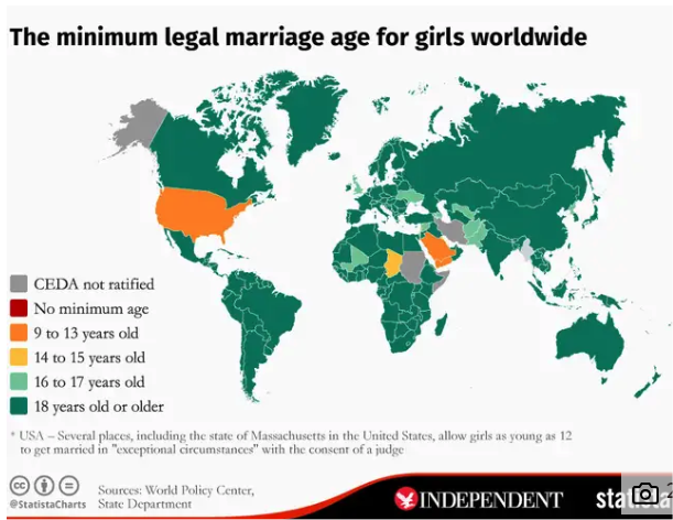 Verden rundt er der mange aldersgrænser for ægteskab. Det kan måske overraske en del at USA kun bliver overgået af Saudi Arabien og Yemen.